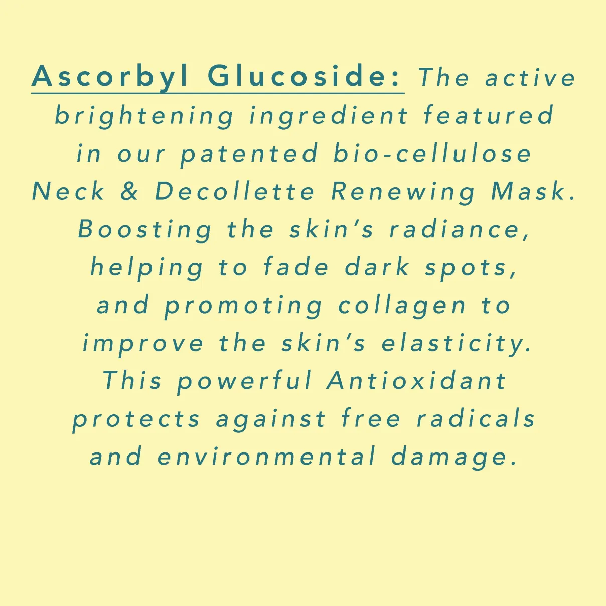Ascorbyl Glucoside* — A stable from of vitamin C as well as a powerful antioxidant to brighten and even your skin-tone and diminish dark spots.